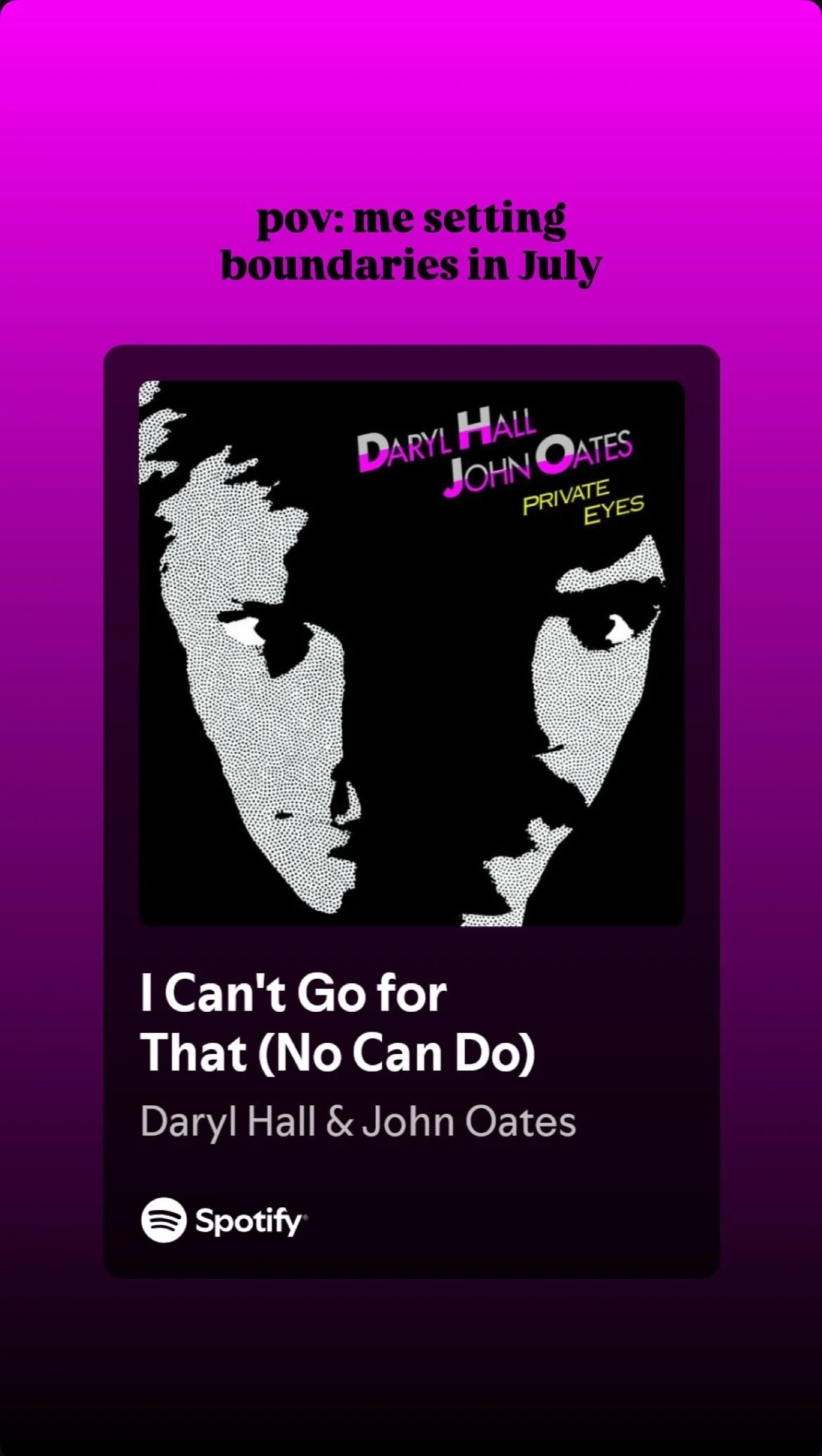 Recently, I Can’t Go For That by Hall & Oates came on and it caught my attention. I posted a screenshot to IG with the caption, “POV: me setting boundaries in July.”
